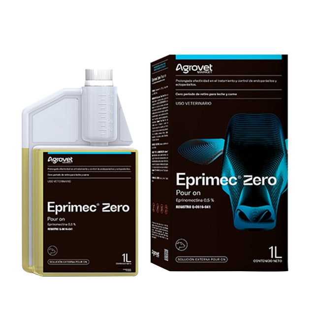 Eprimec ® Zero Pour On es un antiparasitario en solución externa sobre la base de eprinomectina, que por su formulación y su nulo efecto residual al ser aplicado en el dorso de los animales, desde la cruz hasta la base de la cola, forma una película que se distribuye perfectamente sobre toda la superficie corporal del animal, siendo así altamente efectivo para el tratamiento y control de endoparásitos y ectoparásitos. Eprimec ® Zero Pour On está indicado para el tratamiento y control de infecciones parasitarias causadas por formas maduras e inmaduras de nemátodos gastrointestinales, nemátodos pulmonares, tábanos, piojos chupadores y masticadores, ácaros Chorioptes spp., Psoroptes spp. y Sarcoptes spp. Especies de destino: Producto formulado exclusivamente para su uso en bovinos productores de leche y de carne. Agentes susceptibles: Eprimec ® Zero Pour On está indicado para el tratamiento y control de infecciones parasitarias causadas por: