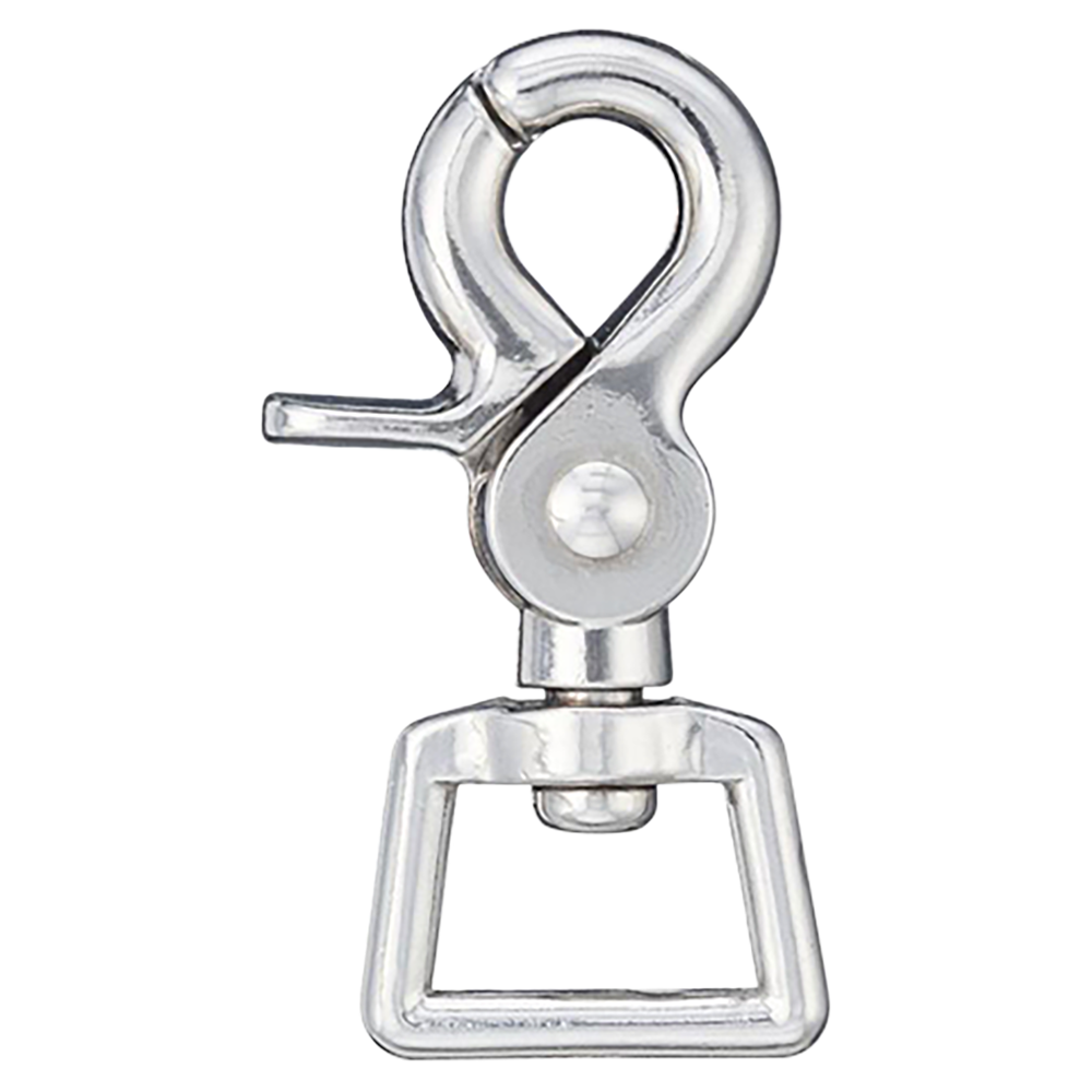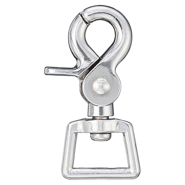 Mosquetón versátil de acero niquelado con ojo giratorio cuadrado. Un complemento de riendas muy popular para cambios de broca más rápidos.