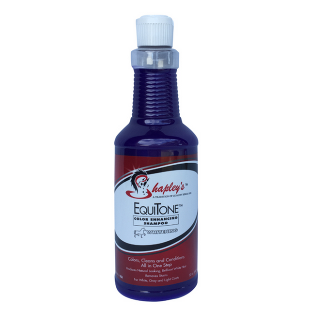 El champú EquiTone es un champú y acondicionador premium de un solo paso que aporta un color intenso y brillante a la vez que limpia y acondiciona. Aporta vitalidad y vitalidad al pelo, aportando un color natural y un brillo radiante. Es imprescindible para rejuvenecer el pelo dañado por el sol o esquilado, a la vez que añade dimensión y reflejos a pelajes, crines y colas opacos y secos. EquiTone enriquece el color natural del caballo. El champú blanqueador aporta un brillo óptico a todos los colores de pelaje, además de dejar los pelajes blancos o grises sin manchas y con un blanco brillante.