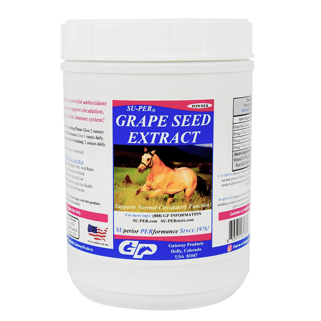 Los radicales libres pueden dañar rápidamente las células sanas del cuerpo y comenzar una reacción en cadena de daño que se propaga rápidamente. Pero no temas: ¡los radicales libres pueden neutralizarse con antioxidantes! Estos nutrientes pueden destruir los radicales libres y crear estabilidad dentro del cuerpo, permitiendo que las células sanas vuelvan a prosperar. Si bien el extracto de semilla de uva SU-PER® es una excelente opción para cualquier caballo que necesite suplementos antioxidantes, puede ser particularmente útil para el caballo de alto rendimiento. La semilla de uva es uno de los antioxidantes más poderosos disponibles y se informa que es 20 veces más fuerte que la vitamina C y 50 veces más fuerte que la vitamina E.