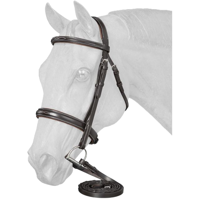 Una brida estupenda para lucir la cabeza de tu montura mientras trabajas en terreno llano. El suave acolchado en la corona, la frente y la muserola hacen de esta una brida muy cómoda para su cazador con una corona contorneada para espacio adicional alrededor de las orejas. La frente ancha y elevada y la muserola con elegantes costuras blancas hacen de esta una brida muy atractiva. Totalmente ajustable en todos los puntos para adaptarse a la mayoría de los caballos. Completo con riendas con cordones para un buen agarre mientras conduces.