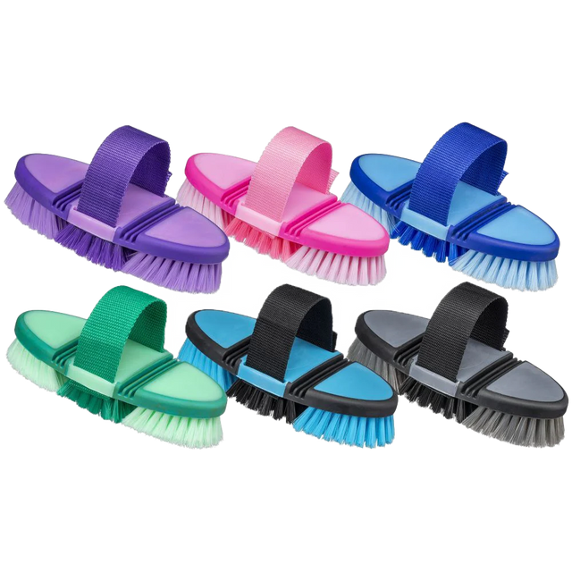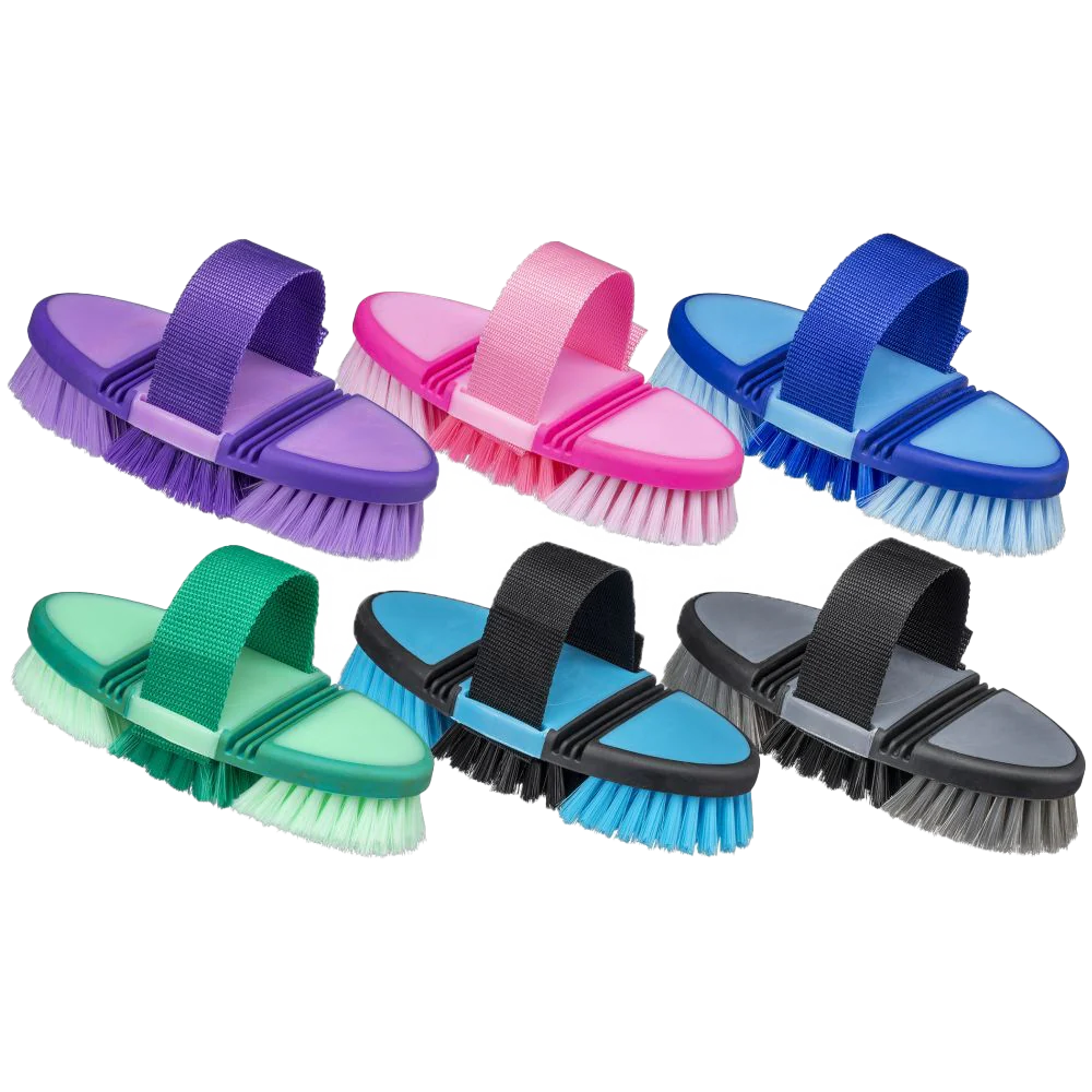 La correa de mano ajustable mantiene el cepillo firme y cómodo en la mano. Este cepillo se flexiona en dos puntos, lo que permite que se ajuste a los contornos del cuerpo del caballo. ¡Este es el cepillo perfecto para las piernas!