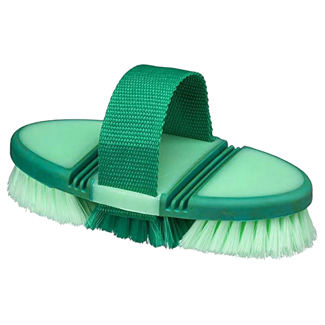 La correa de mano ajustable mantiene el cepillo firme y cómodo en la mano. Este cepillo se flexiona en dos puntos, lo que permite que se ajuste a los contornos del cuerpo del caballo. ¡Este es el cepillo perfecto para las piernas!