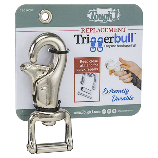 ¡No tires esa cuerda vieja cuando puedes simplemente reemplazar el broche! Este bull snap de Tough1 está inteligentemente diseñado para un fácil reemplazo. La barra final se desenrosca con un destornillador Phillips, lo que le ahorra dinero y frustración. También cuenta con el diseño patentado Triggerbull de fácil apertura que permite su uso con una sola mano. Este broche está hecho de acero con un acabado niquelado para mayor resistencia y durabilidad. Compite con un ojo giratorio cuadrado y una atractiva tarjeta de presentación. Vendido Individualmente.