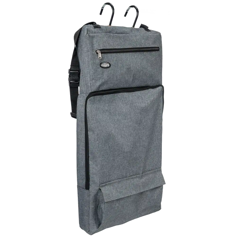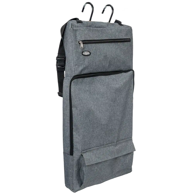 Organizador portátil ideal para guardar y transportar utensilios de aseo equino. Fabricado en nylon heavy‑denier, incorpora un bolsillo principal con cierre y siete compartimentos interiores para cepillos y botellas. También cuenta con un bolsillo superior con cremallera y uno inferior tipo para objetos pequeños. Además, tiene ganchos metálicos incorporados para colgarlo fácilmente y una correa de hombro ajustable para transporte cómodo.