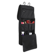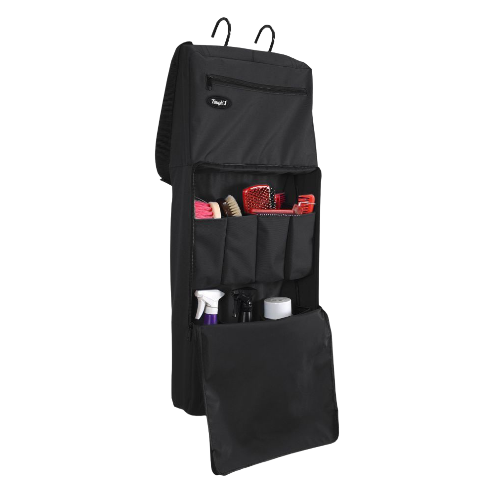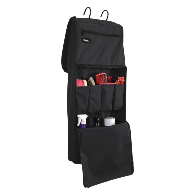 Organizador portátil ideal para guardar y transportar utensilios de aseo equino. Fabricado en nylon heavy‑denier, incorpora un bolsillo principal con cierre y siete compartimentos interiores para cepillos y botellas. También cuenta con un bolsillo superior con cremallera y uno inferior tipo para objetos pequeños. Además, tiene ganchos metálicos incorporados para colgarlo fácilmente y una correa de hombro ajustable para transporte cómodo.