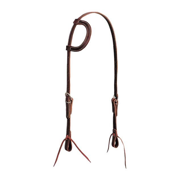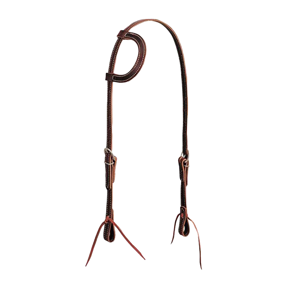 Hecho de cuero látigo color café de una sola capa de 5/8", esta cabezada presenta un diseño simple a un excelente precio. Esta cabezada de cuero látigo suave y flexible tiene ajustes dobles en las mejillas y puntas de amarre de encaje de cuero curtido con alumbre.